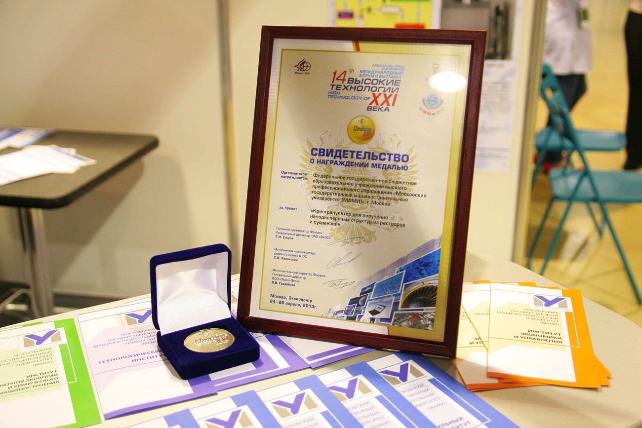 С 24 по 26 апреля 2013 года в ЦВК «Экспоцентр» прошел 14-й Международный форум и выставка «Высокие технологии XXI века-2013». Новейшие разработки в области нанотехнологий продемонстрировал и Университет машиностроения – проект «Криогранулятор для получения нанодисперсных структур из растворов и суспензий» был представлен Учебно-научным центром «Наноматериалы и нанотехнологии». Проект был удостоен медали Форума.